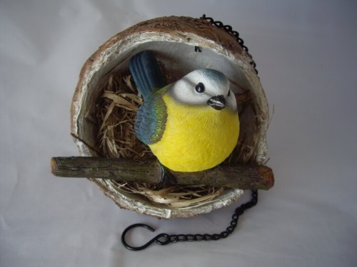 Garden Bird Ornament BLUE TIT in HANGING COCONUT SHELL made from High Quality Resin, Beautiful Detail!